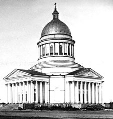 После изгнания наполеоновских войск из пределов Отечества симбирское дворянство решило посвятить существующий Троицкий собор имени Александру Невскому, "с приобщением к нему двух приделов: одного для сохранения имени существующего храма, а другого - для вмещения полковой церкви Симбирского ополчения, в котором преимущественно в определенное время отправлялось бы поминовение о воинах, положивших жизнь за Веру, Царя и Отечество". Были спроектированы план и фасад перестройки старого Свято-Троицкого собора , но Строительный комитет Министерства внутренних дел после рассмотрения проекта предложил симбирскому дворянству выстроить новый храм. Разместить новый храм было решено несколько южнее старого, в центре площади, выходящей к волжскому обрыву. Впоследствии эта площадь получила название Соборной. Троицкий собор был построен в 1827-1841 гг. Автор проекта - архитектор Михаил Петрович Коринфский (Варенцов) (1788-1851 гг). Он учился в Арзамасской школе живописи, затем в Академии художеств. Проходил практику на строительстве Казанского собора в С-Петербурге у известного зодчего А.Н. Воронихина, дома графа Строганова, дачи Зиновьева и др. Свыше десяти лет молодой зодчий проектировал и сооружал церкви, казенные и частные здания в родном Арзамасе, других местах Нижегородской и Пензенской губерний. В 1823 году М.П. Коринфский принял предложение занять место архитектора симбирского дворянского собрания. В действительности же одаренного архитектора пригласили для срочной разработки проекта величественного храма, который был заложен 7 сентября 1824 г. в присутствии императора Александра I, который собственноручно положил в его основание первый камень и известку, "нарочно приготовленною для сего случая серебряною золоченою лопаткою", поднесенною князем М.П. Баратаевым. К 1832 году каменная кладка собора была окончена. Архитектор мог гордиться своим творением: получилось благородное по общему силуэту сооружение, более зрелое и законченное, чем Воскресенский собор в Арзамасе. 22-23 августа 1836 года Симбирск посетил император Николай I. Во время посещения города он сделал множество указаний по возведению новых построек города, особенно центральной его части с недостроенным собором. Через пять лет, 15 сентября 1841 года новый кафедральный Свято-Троицкий собор был освящен. Построенный в стиле классицизма, крестообразный в плане и окруженный четырьмя коллонадами, над которыми возвышался один купол, своим видом он несколько напоминал Исаакиевский собор в Петербурге. Собственной колокольни при новом соборе не было. Внутри Свято-Троицкий собор поражал своим обширным пространством и яркой настенной живописью. Со времени старого города в нем сохранялся Образ Спаса Нерукотворного, первоначально находившейся на главных воротах Симбирска. В отношении к ближайшему окружению собор представлял собой объект архитектурного ансамбля, включающего ряд зданий, выполненных, как и собор, в стиле классицизма. При его помощи удалось сформировать в середине XIX века в центральной части Симбирска целую систему памятников архитектуры и градостроительного искусства. В эту систему вошли дома Дворянского собрания, губернского правления, губернаторский дом (снесен при строительстве Ленинского мемориала), губернская гимназия . В 1927 году Свято-Троицкий собор был включен 