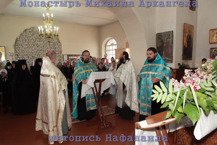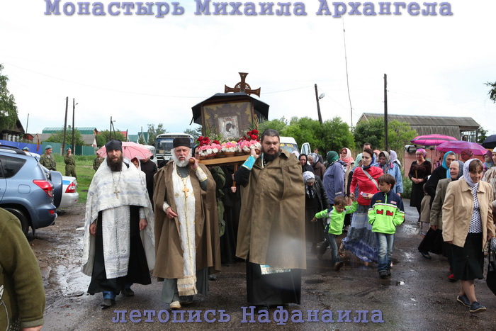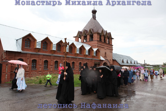 Женский Монастырь Михаила Архангела. Шел сильный дождь и священники встретили нас, одетые в дождевики военного образца, из-под которых виднелись епитрахили и поручи, Монахини же не прятались под зонты и куртки, все были едины с хоругвями и крестами шли стройными рядами с Богородичными распевами. От центральных ворот к храму Архангела Михаила монастырские труженицы создали нетканые ковры из травы и цветов, для входа в Обитель Божией Матери, особенно близкой и понятной женскому сердцу. В монастыре полным ходом идут работы по строительству новой колокольни, укрепительной дамбы на прудах. Игуменья Магдалина принимала участие во встрече и молебне у Святого Образа Богородицы.