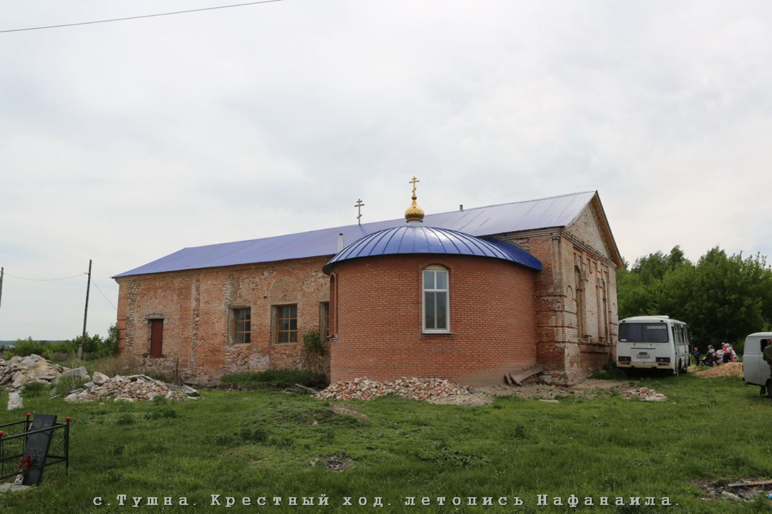 Крестный ход в селе Тушна. Восстанавливается храм с богатой историей в селе Тушна. Батюшка Виктор рассказывает ,как обращался в разные высокие инстанции за помощью в восстановлении Церкви, которая включена в реестр памятников архитектуры, но везде получил отказ. Возможно ситуация в настоящее время изменится, по словам губернатора Морозова С.И. в ближайшее время могут быть выделены федеральные средства для возрождения подобных храмов. Будем молиться. А пока, в старой церкви полностью произведена замена кровли, реконструирован алтарь снаружи и внутри, где и проходят Богослужения. Этим летом на очереди восстановление трапезной и второго придела. Пока же службы проводятся в приделе св. Параскевы Пятницы.