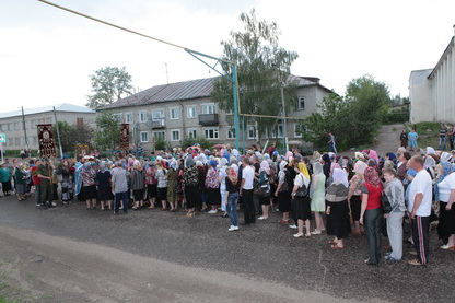 В поселке встретили встречным крестным ходом с Богородичными песнопениями. Площадь перед храмом была полна верующими, которые вставали под икону, преклоняясь перед Божией Матерью.