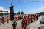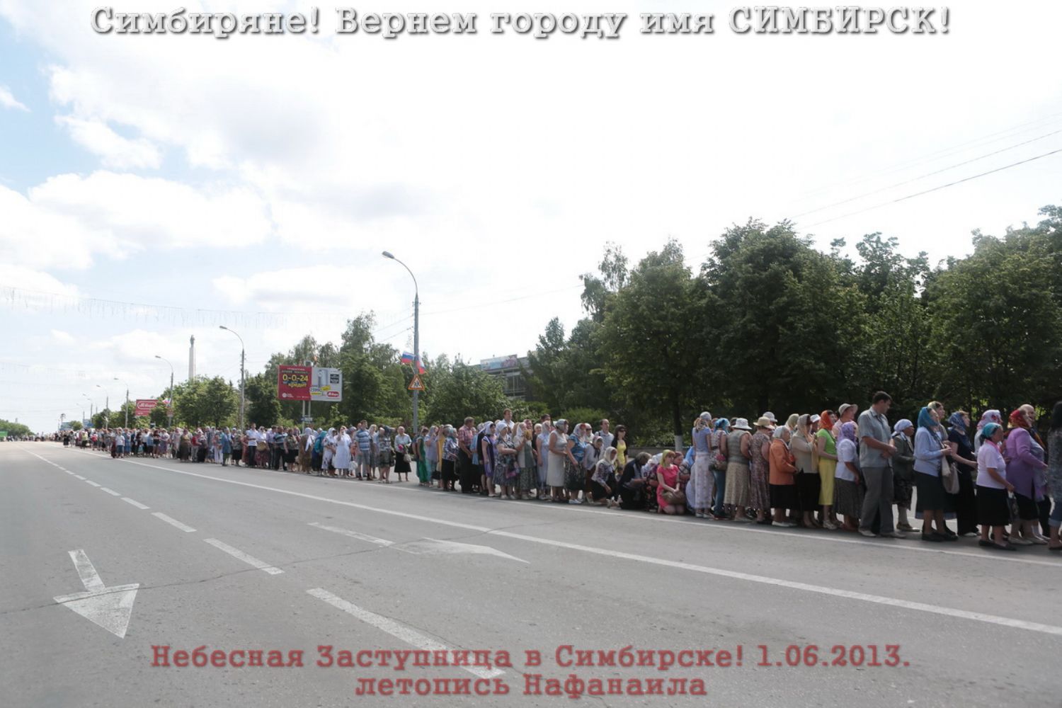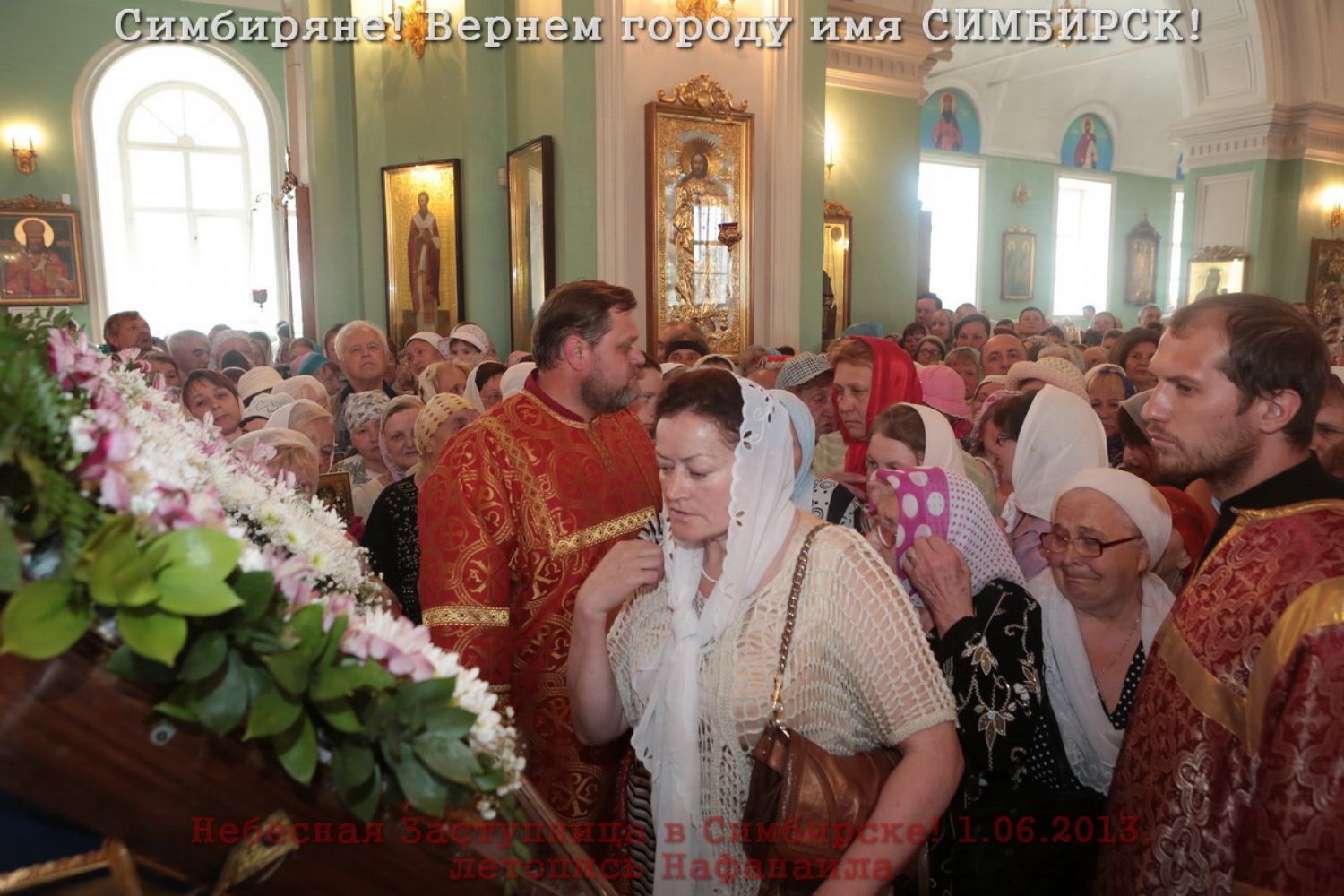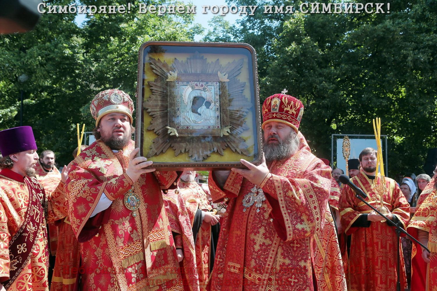 Сегодня на площади Победы симбиряне в 91-ый раз встретили Святыню нашей земли, Небесную Покровительницу губернии, Чудотворную икону Божией Матери Казанская Жадовская. Крестный ход, шел за своей путеводной звездой с 11 мая. Охраняли и несли образ Богородицы десантники из 44 бригады ВДВ. Священники митрополии бережно и с молитвою приняли носилки с иконой и пронесли через город на площадь Ленина, прежде Соборную, именно на то место, где стоял и был зверски разрушен Свято-Троицкий собор града Симбирска, возведенный в честь победы России над Наполеоновскими войсками в 1812 году и был краше и величественнее Исакиевского собора в Петербурге! На этом месте и был отслужен торжественный молебен двумя архиереями: епископом Мелекесским и Чердаклинским Диодором и епископом Барышским и Инзенским Филаретом. После Богослужения владыки обратились к многочисленным верующим, пришедшим на встречу с Божией Матерью.