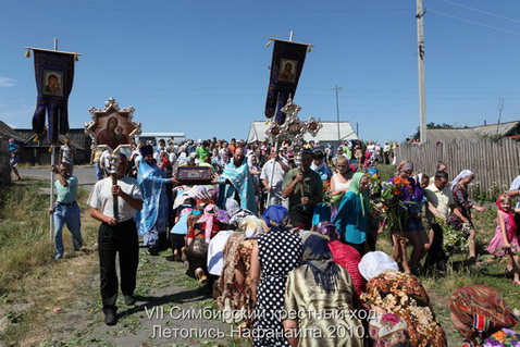 Село Кивать. Такого большого числа пришедших в этом селе еще не было ни в один из семи лет крестных ходов! Люди стояли на коленях длинной цепочкой от самой дороги до храма.