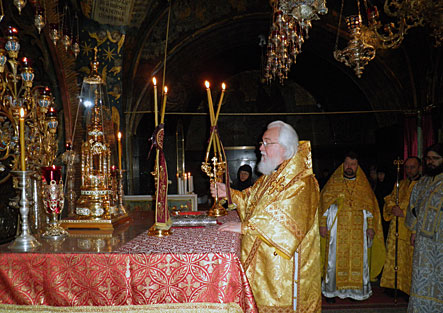 Были на аудиенции у Блаженнейшего Патриарха Иерусалимского Феофила III, который очень радушно нас встретил и благословил наше паломничество по местам Святых Евангельских воспоминаний. Ночью с 7-го на 8-е декабря мы совершили богослужение в храме Гроба Господня. Господь сподобил меня впервые совершить Божественную Литургию на Голгофе, на месте распятия Христа. Сколько раз служил в этом храме, всегда совершали богослужение на самом Гробе Господнем. Литургию возглавил митрополит Аристарх, управляющий делами Иерусалимской Патриархии, очень благостный и доброжелательный Владыка.