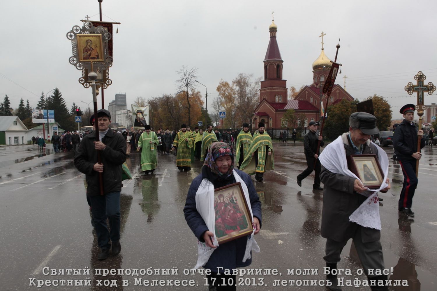 Многие шли, прикрывшись зонтами, дождь не прекращался ни на минуту. За два часа пути все мы промокли почти насквозь: сверху от дождя, снизу от бесчисленных луж. По дороге, вся дружная колонна пела молитвы святому заступнику. Много раз останавливались, священники по очереди читали Евангелие и кропили святой водой на четыре стороны.