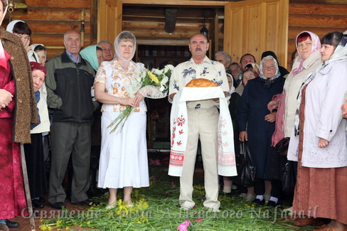Зеленая дорожка от асфальта до храма выстелена свежескошенной травой, украшенной живыми цветами: так сельчане встречали своего архиерея. С хлебом и солью на высоком церковном крыльце просил благословения у Владыки Прокла создатель храма Волков Анатолий Григорьевич.